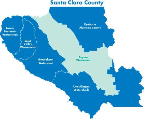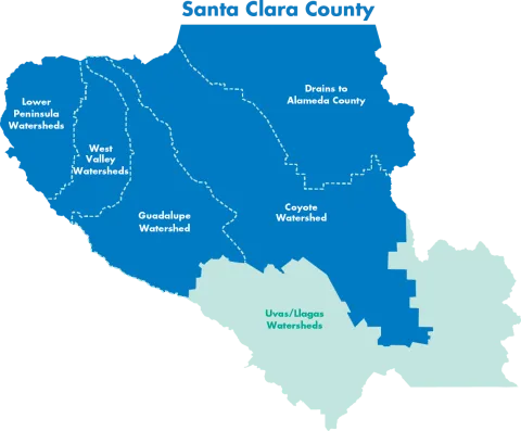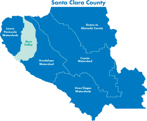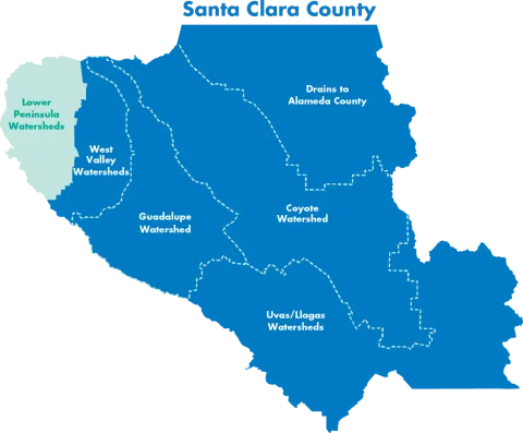 A watershed is the area of land that drains to a common waterway. In Santa Clara County, our creeks and rivers catch rain and runoff from storm drains and carry the water north to San Francisco Bay or south to Monterey Bay. Along the way, some of the water is used to fill reservoirs for drinking water, replenish the underground aquifer and create better habitat for fish and wildlife.