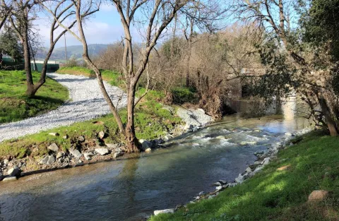 In March 2024, Valley Water completed constructing the Bolsa Road Fish Passage Project. Construction began in June 2023, with in-channel work (including riffle-pool structures, slope protection, benches, and hydroseeding) completed in October 2023. The project installed a gradually sloped riffle-pool stream complex and rehabilitation of the banks adjoining the riffles and pools to achieve a stable channel configuration.