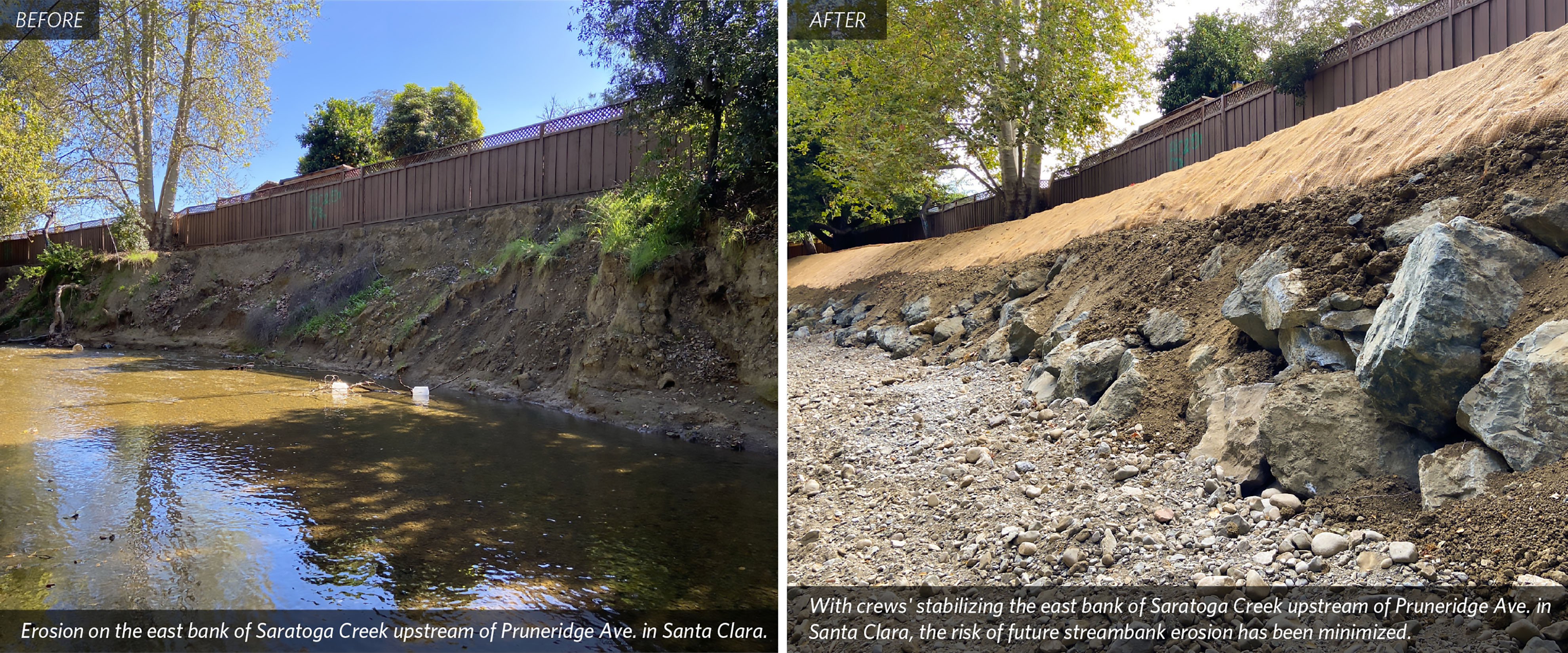 High and sustained water flows can cause extensive damage to creek banks, eroding existing flood protection improvements and natural elements. Repairing creek banks also helps protect neighboring homes and property from damage.
