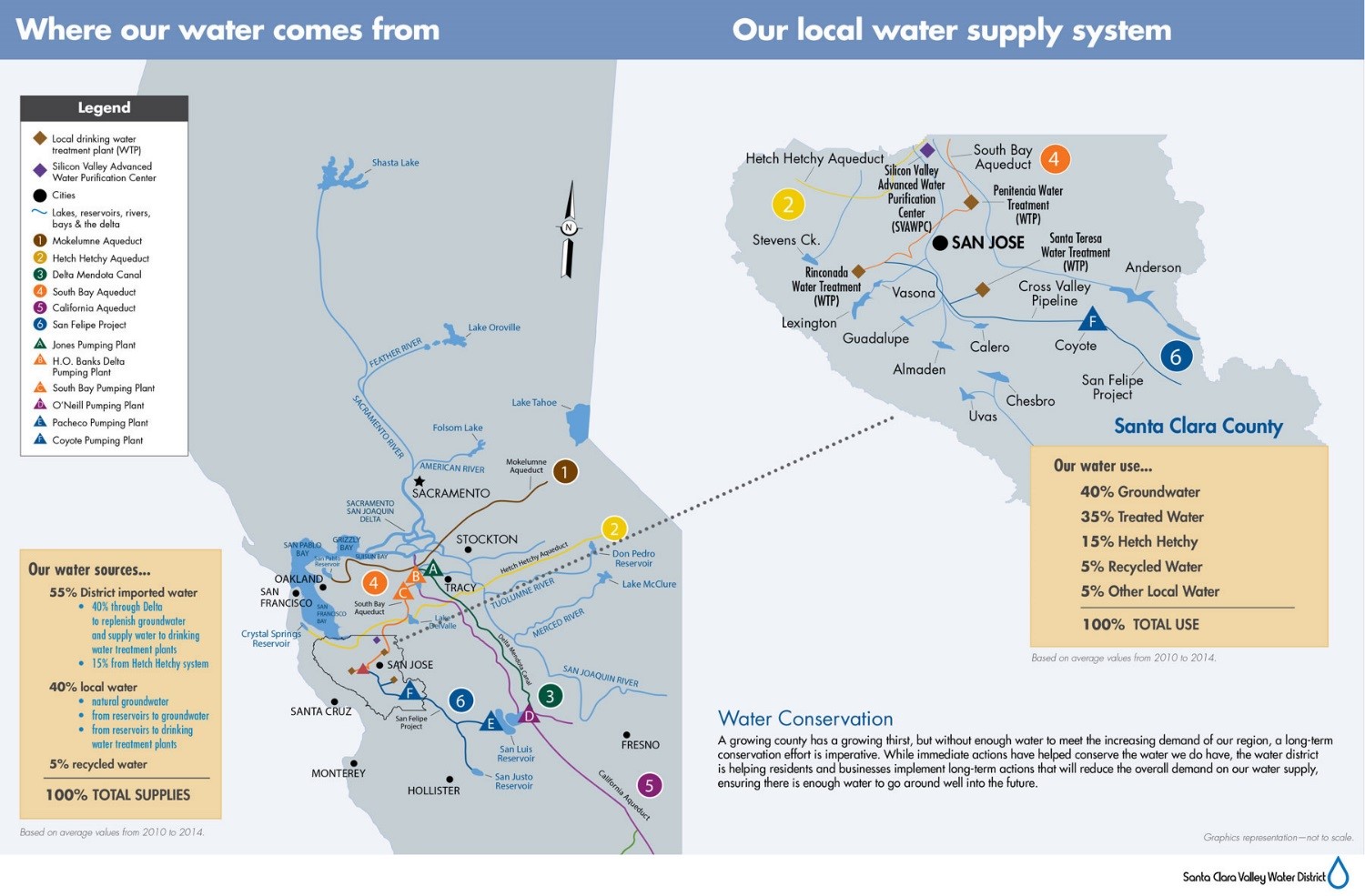 Santa Clara County’s current water supply system is a complex mix of water supply sources and infrastructure. The district operates and maintains ten reservoirs and dams, dozens of groundwater recharge basins, almost 150 miles of pipelines, three treatment plants, an advanced recycled water purification plant, and three pump stations. Water supplies include local surface water and groundwater, imported water, and recycled water. Water conservation is also an important part of the of the water supply mix because it reduces water demands and helps improve reliability during droughts.